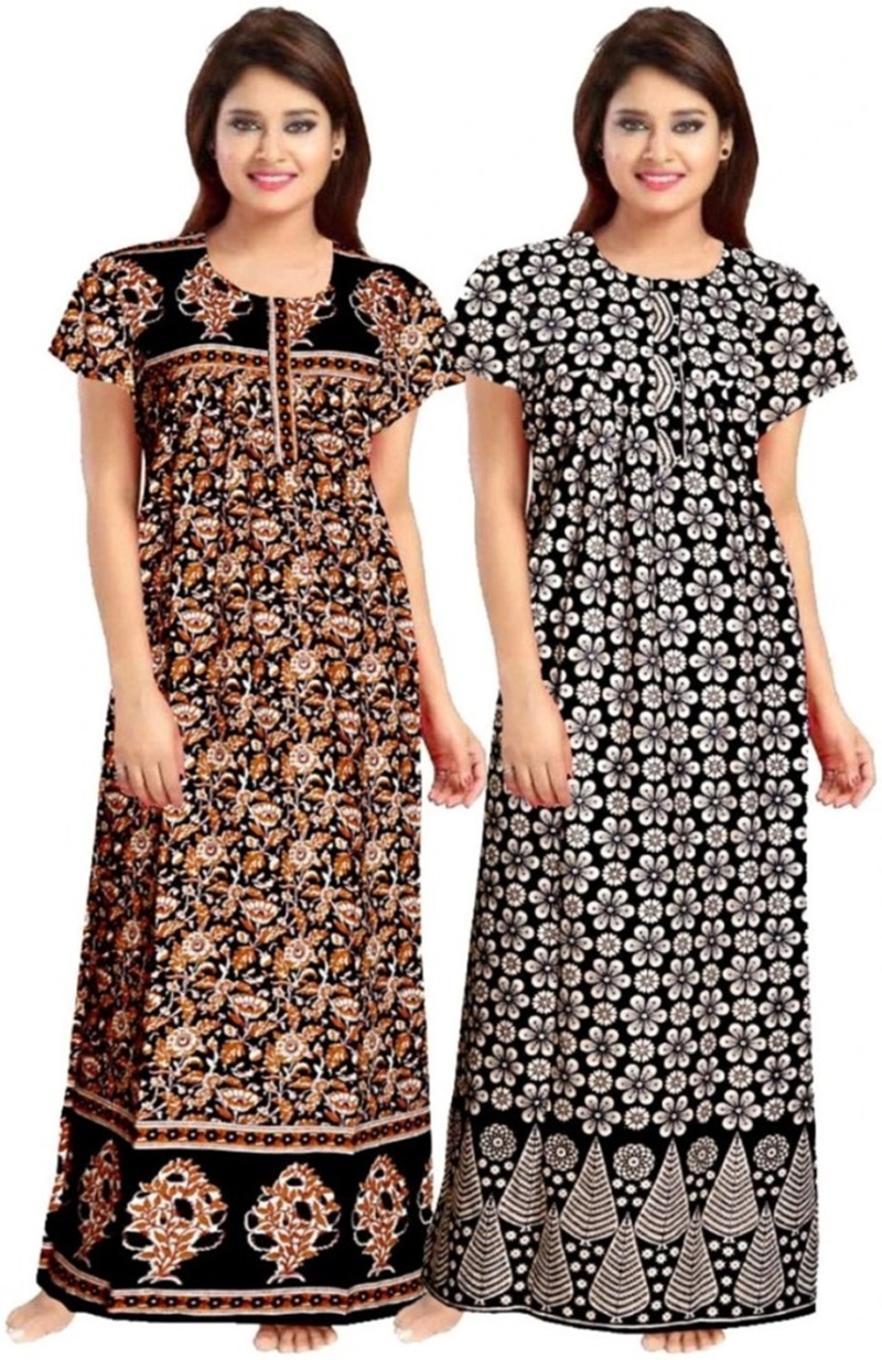 Cotton Nighty for Women || Long Length Printed Nighty/Maxi/Night Gown/Night Dress/Nightwear Inner & Sleepwear for Women’s (Combo Pack of 2) (DSMF169-Nighty (P2)Brown Black)