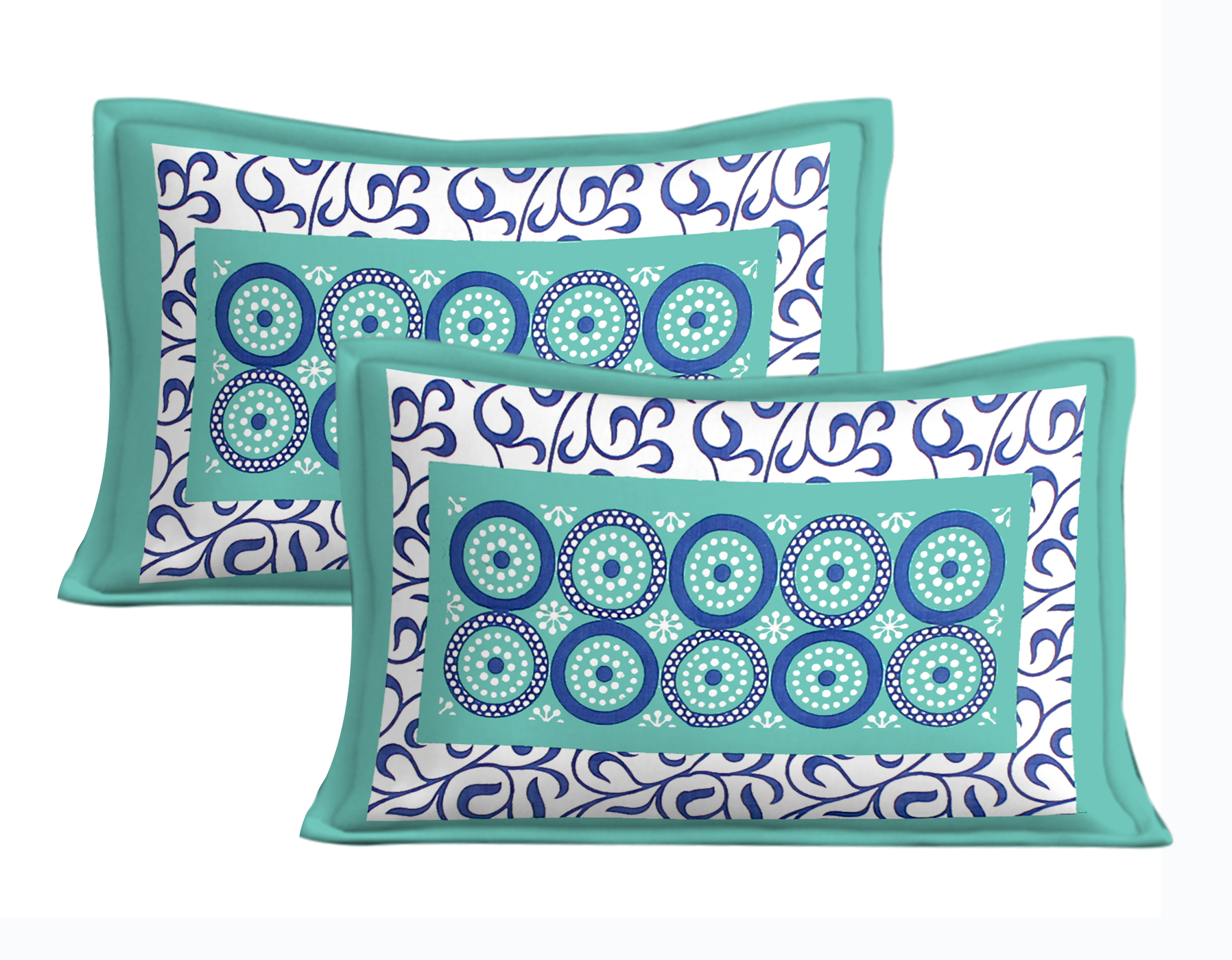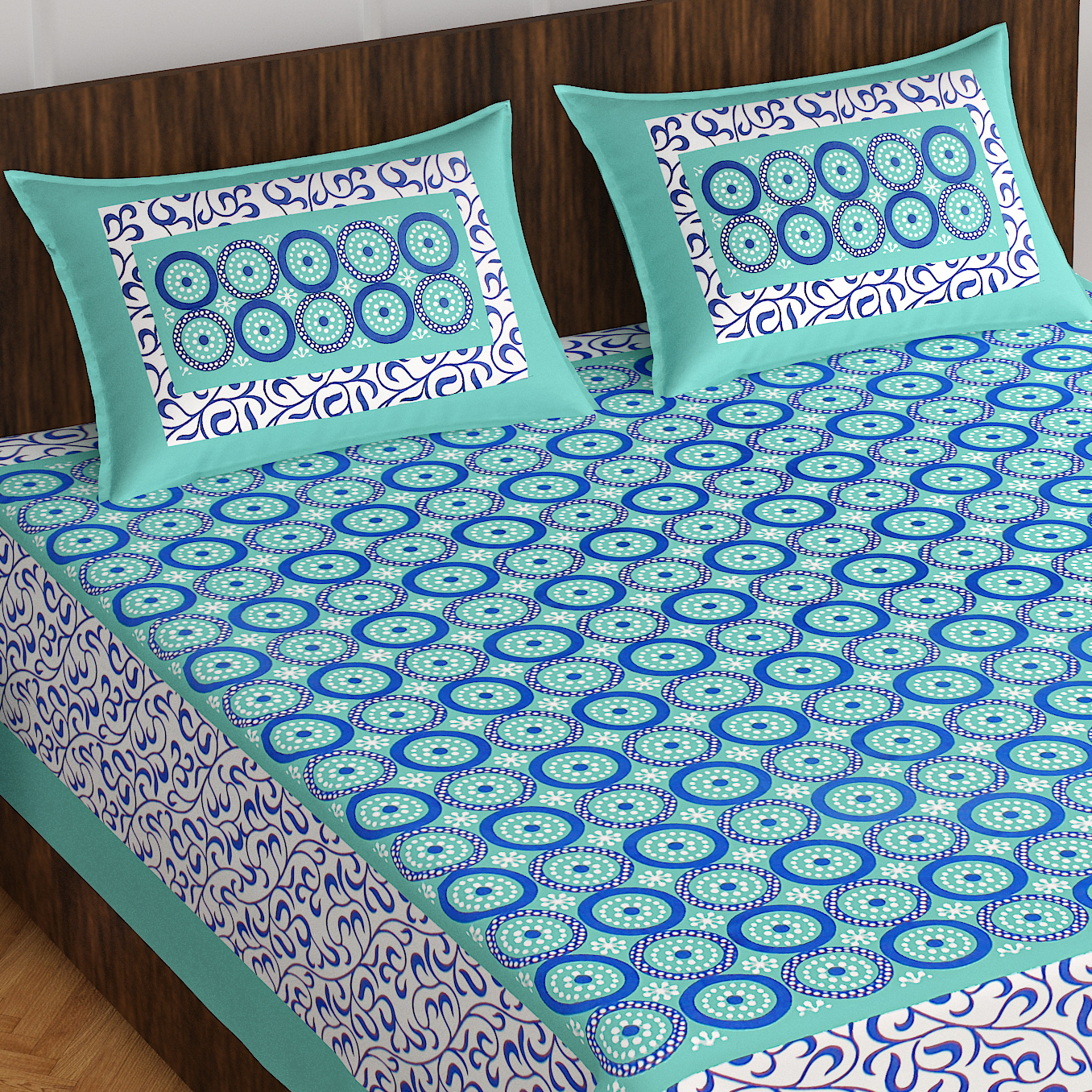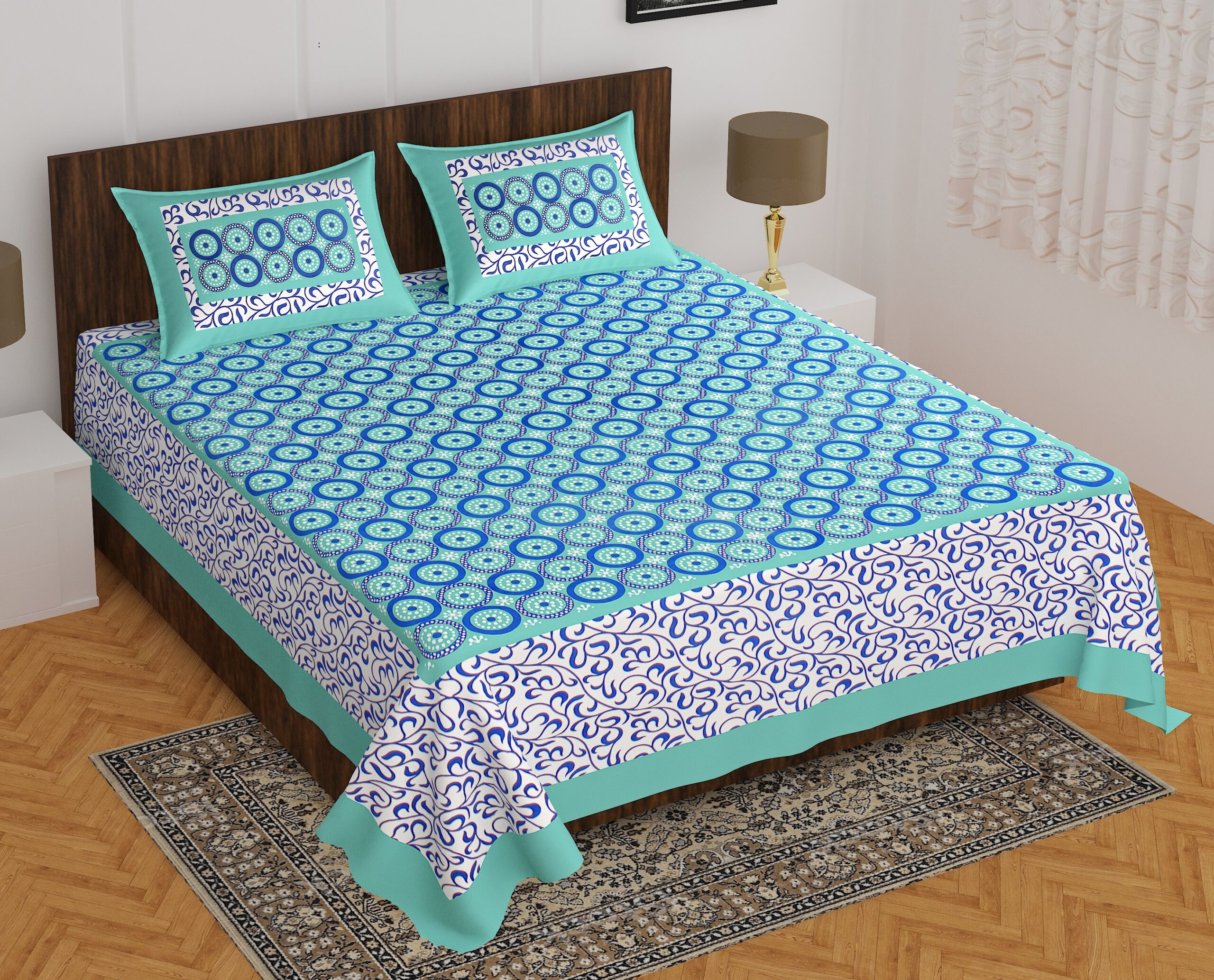 Rajasthani Jaipuri Traditional Sanganeri Jalebi Print 100% Cotton Double Size Bedsheet with Two Pillow Covers (Seagreen) (MD1025-BST DBL Jalebi_Seagreen)