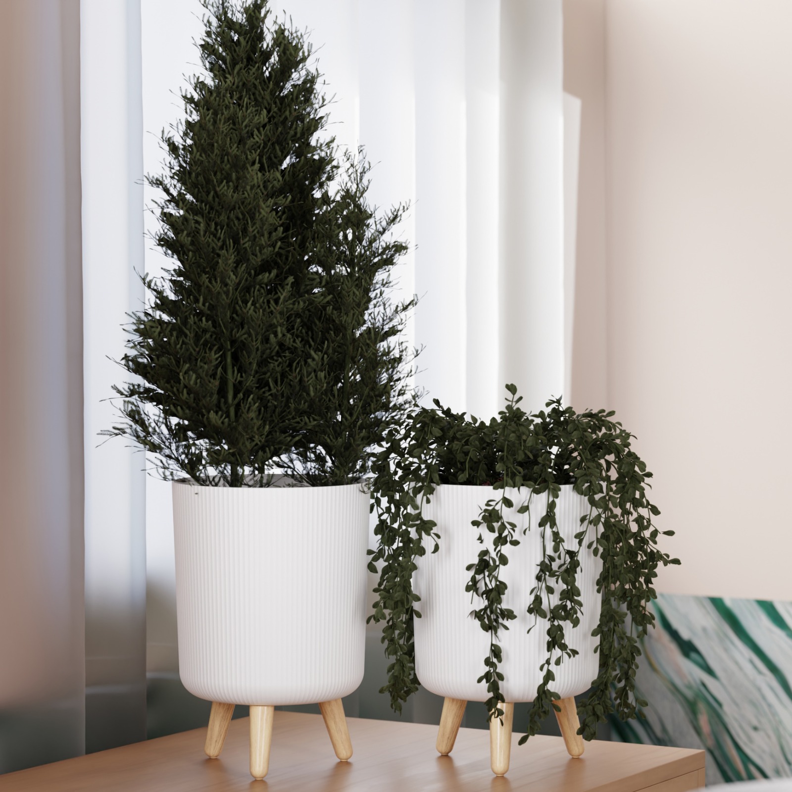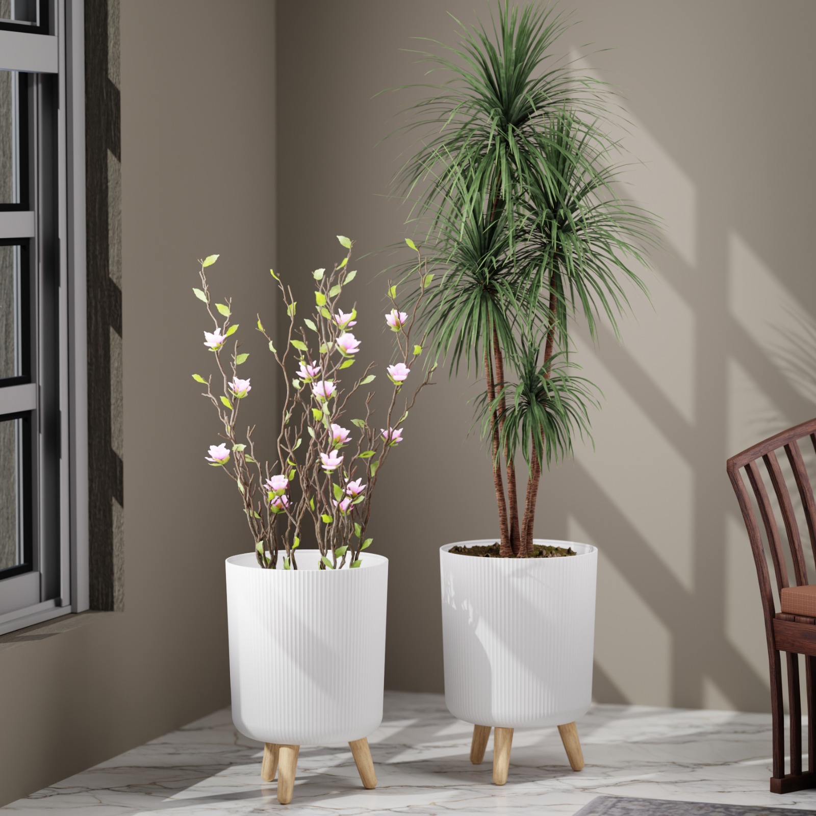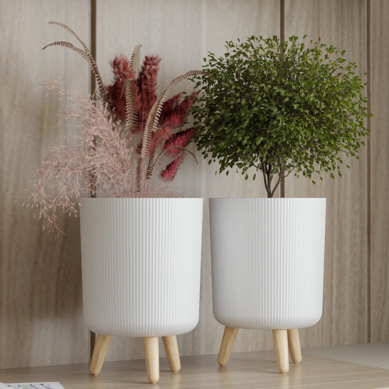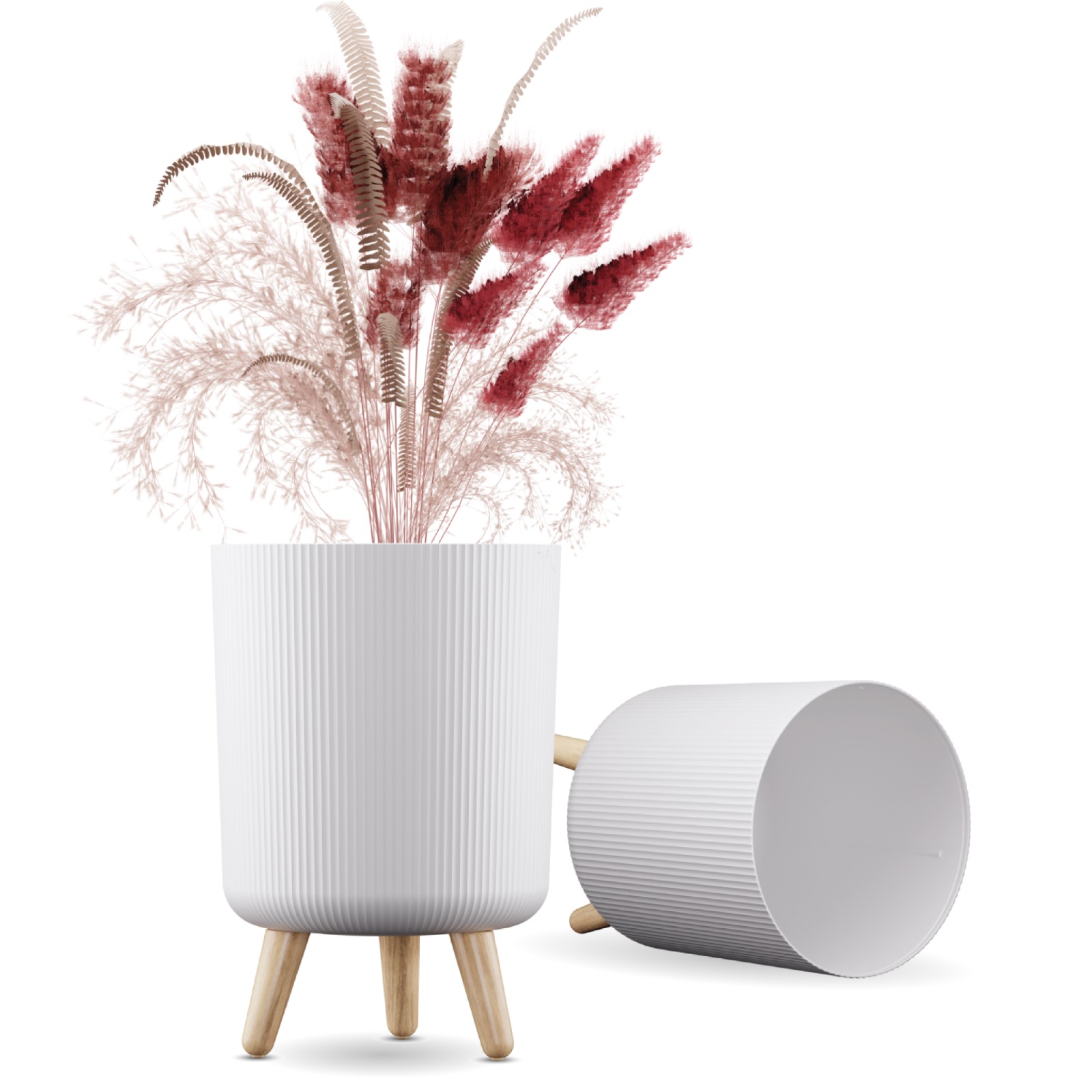 DropShopee Modern White Flower Pot with Wooden Legs 13 Inch Tall 9L Capacity | Indoor Outdoor Planter for Home Garden Balcony Decor Ribbed Design Sturdy Plastic Mid-Century Style (Pack of 2) (SL003-BIG FLOWERPOT (Set of-2)